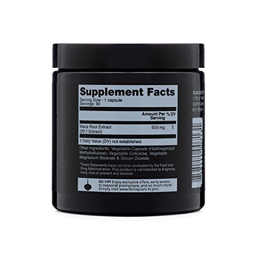 -. Feature : SUPERFOOD OF THE ANDES: Reap the benefits long used in ancient Incan medicine. Growing in the world's most remote locations at the highest of altitudes, Maca Root Extract has become commonly utilized today as an aphrodisiac and fertility booster. / HIGHEST POTENCY FOR SUPERIOR RESULTS: Toniiq's Maca Root Pills have by far the highest available potency at a 20:1 extract ratio per serving (magnitudes more than most available black maca root, red maca root, royal maca root, and bulk maca root organic products). Applicable to both maca root for men and maca root for women. / FAIR TRADE, ORGANIC, ALL NATURAL: Our organic Maca Root Supplement is non-GMO, has no additional preservatives and is free of gluten, soy, milk, egg, shellfish, corn, wheat, and peanuts. Made in a FDA registered facility adhering to strict GMP (Good Manufacturing Practices), right here in the USA. / TONIIQ MONEY BACK GUARANTEE: We always hope you're happy with your new Maca Root, but if you've had anything less than a first-class experience, we'll refund your money back, no questions asked. / ALSO RELATED TO - Peru, Peruvian tea, Gelatinized Maca, Raw seeds, Herbal Ejaculoid, Royal Herbal Roots and Oil