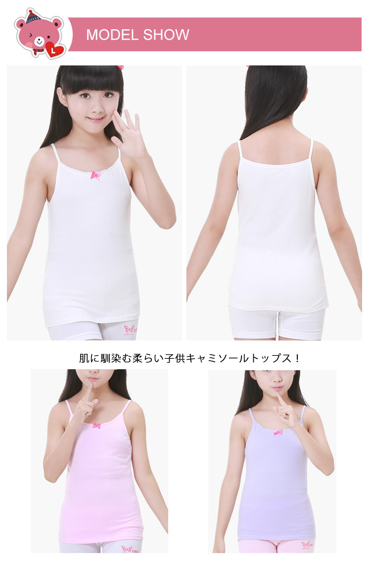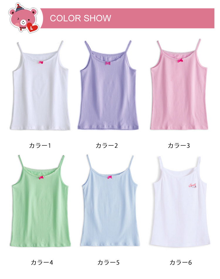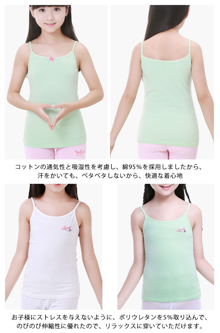 | 肌に馴染む柔らい子供キャミソールトップス!コットンの通気性と吸湿性を考慮し、綿95%を採用しましたから、汗をかいても、ベタベタしないから、快適な着心地お子様にストレスを与えないように、ポリウレタンを5%取り込んで、のびのび伸縮性に優れたので、リラックスに穿いていただけます。今なら嬉しい3タイプをご用意しましたのでデザイン違いのを揃えたくなる女の子キャミソールトップスです。 | |
