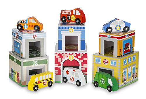 -. Feature : Match-and-stack set of 6 nesting buildings and 6 wooden vehicles / Pair the pieces by color and number for exciting first-concepts practice / Vehicles include fire engine, school bus, recycling truck, police car, ambulance, and Tow truck / Buildings nest for neat and easy storage / Ages 2+; 15.5" x 6.25" x 5.75" pkg