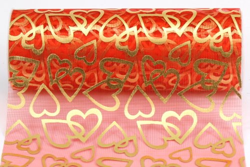 Kel-Toy Heart Print Sheer Fabric, 6-Inch by 10-Yard, Red with Gold Hearts