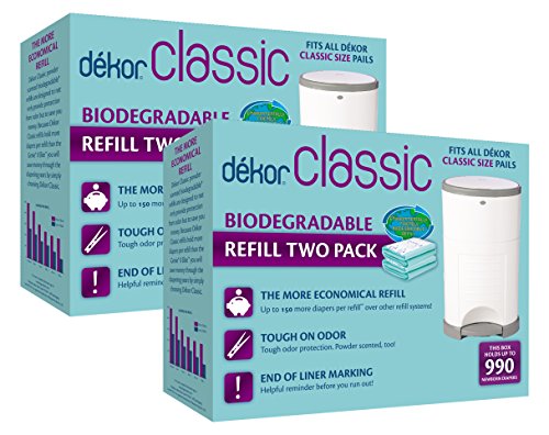 The popular biodegradable version of the refill! Convenient and economical, the Dékor refills are easy to use and offer great capacity, holding up to 240 diapers each. These refills will fit all classic size Diaper Dekor pails. They will NOT fit Plus sized pails. The size refill you need is determined by the size of the pail. This can be determined by viewing the label on the inside of the door of your pail. Note: Refills are not interchangeable between Plus and "Regular" sizesFeature