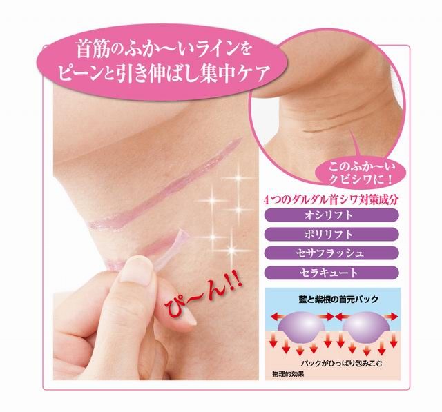 | 使用方法 | 首の塗布したい部分nを清潔にした後、適量を手にとり、首元の気になる部分にムラなく薄く塗ってください。 10~15分後、表面が完全に乾いたらゆっくりとはがしてください。 肌の状態にあわせて、週に2回程度ご使用ください。 |