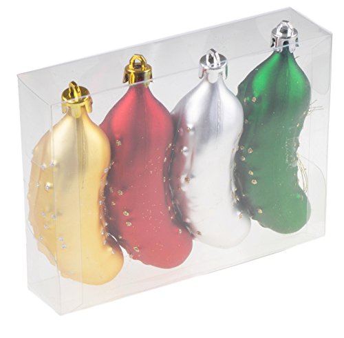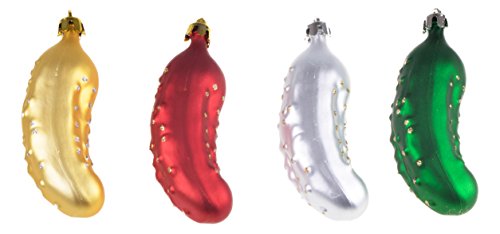 SPRUCE UP YOUR CHRISTMAS TREE: This 4 pack of pickles comes in 4 colors including Gold, Green, Red, and Silver, each with sparkling spots all over. Play the Hide the Pickle Game with these fun and unique colored pickles! You won't find them on anyone else's tree!