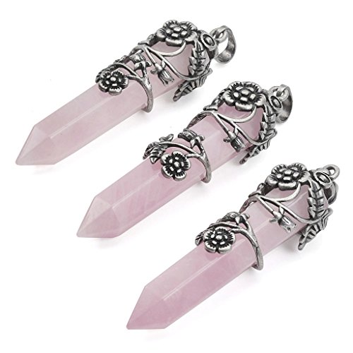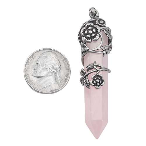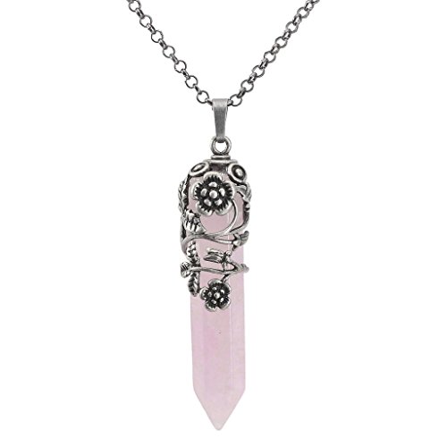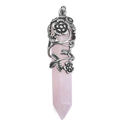 Top Plaza Antique Silver Flower Wrapped Natural Rose Quartz Healing Crystal Necklace