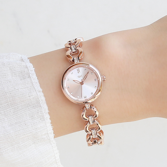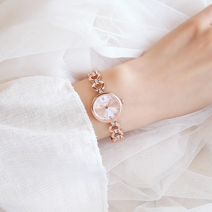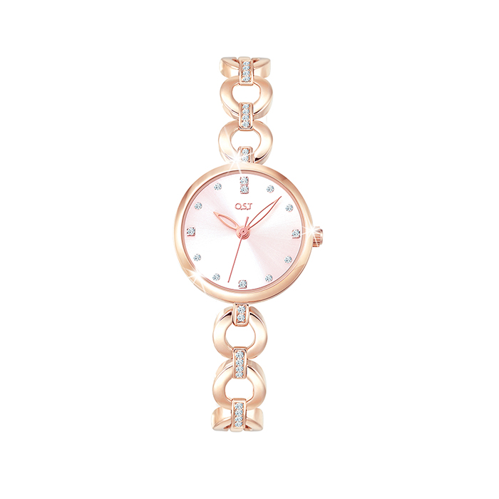 은은한핑크빛 다이얼이 돋보이는 팔찌형시계입니다.