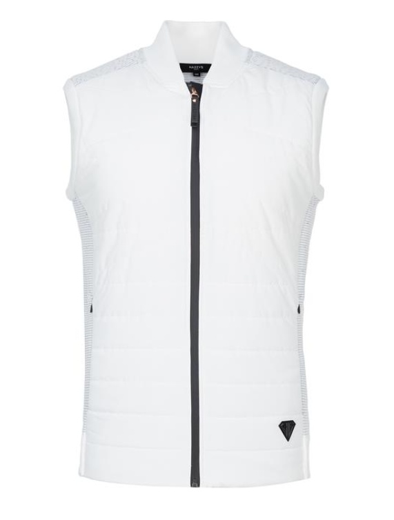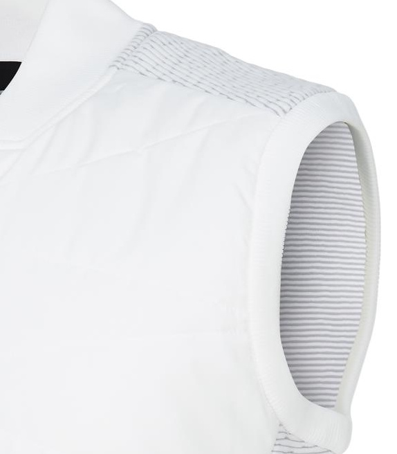 뒷면으로 은은한 스트라이프 패턴을 배색해 세련된 느낌을 주는 베스트입니다.