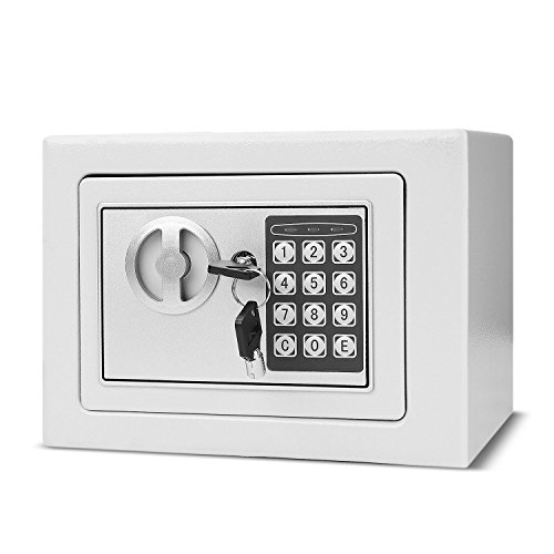 -. Feature : Durable and easily concealable electronic steel fireproof safy box with over 550 cubic inches of secure interior storage space; Keep your valuables carefully locked away with the security safe box. Capacity that nicely accommodates a wide range of items, including legal documents, passports, jewelry, cash, and more. / Reprogrammable Digital Access: Keyless entry with a custom-created 8-digit code so you won't find yourself fumbling for the key when urgent access is required; Security safe combination lock control system with protection features which will refuse input of security code after the wrong PIN is entered for three times and lock a furthur 5 minutes after 6 error passcode inputs / 2 Emergency Override Keys: Two emergency override keys are included, which makes it possible to open the safe and access your valuables even if you forget your passcode or if the keypad batteries run out / Live-Door Bolts and Pry-Resistant Concealed Hinges: Built from solid, pry-resistant steel, the security safe offers red reliability and long-lasting strength. Eliminates potential pry attack points with an elegant finish / Adjustable Shelf & Mounting Hardware: Allows for easily bolting it to a floor, shelf, dresser, or wall (when supported underneath); Includes hidden anchoring design to secure to a wall or floor without visible bolts (heavy-duty bolts included)