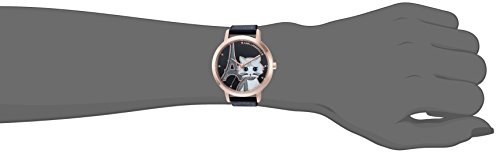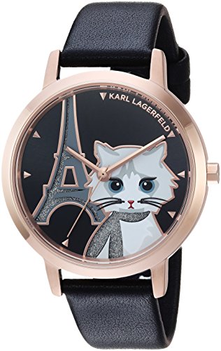 Rose gold-tone plated stainless steel case; detailed black pearlized dial featuring silver glitter Eiffel Tower, white Choupette the cat with a silver glitter scarf, and rose gold-tone hands and logo