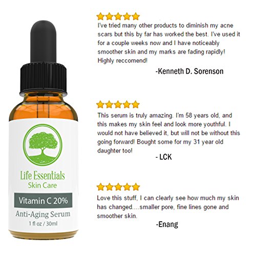 -. Feature : THE BEST VITAMIN C SERUM: With 20% Active Vitamin C, This Powerful Anti-Aging Serum Has Been Formulated For Men & Woman With A Concentrated Base Of Pure Vegan Hyaluronic Acid & Vitamin E To Smooth, Freshen & Revitalize Your Youthful Complexion. / YOU WILL LOVE THE RESULTS: Life Essential's Vitamin C Serum Will Dramatically Increase Collagen Production Resulting In A Much Smoother & Even Skin Tone. In Addition, The Serum Aids In Fading Dark Spots, Acne Scars, Stretch Marks & Even Works As A Melasma Treatment. / HIGHEST QUALITY OF ORGANIC INGREDIENTS: Life Essential's Vitamin C Serum Is Formulated With All Natural, Organic & Vegan Ingredients. Vitamin C Serum Will Be Your Skins New Best Friend. Perfect For Even The Most Sensitive Of Skin Types. / MADE IN THE USA: Life Essential's Vitamin C Serum Is Proudly Formulated Here In The USA In An FDA Registered Laboratory & Is Cruelty Free (We Have Never & Will Never Test Our Product On Animals). / 100% SATISFACTION GUARANTEE: As A Family Company, We Only Sell Product We Are Proud To Use Ourselves. We Know You Will Love Our Vitamin C Serum, But If For Any Reason You Are Unsatisfied With Your Purchase, We Will Refund Your Money, No Questions Asked. In Fact, You Don't Even Need To Return The Bottle. WE LOOK FORWARD TO WELCOMING YOU INTO THE LIFE ESSENTIALS SKIN CARE FAMILY!