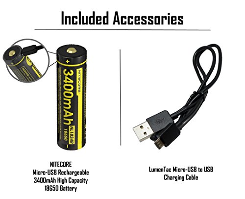 - PACKAGE CONTENTS - Nitecore SRT7GT, Holster, Nitecore lanyard, Removable Titanium Belt Clip, Replacement tail switch cover, Tactical Ring, replacement o-ring, user manual, & BONUS NL1834R 3400mAh USB Rechargeable 18650 battery with Built-In Micro-USB Charge Port & LumenTac USB to Micro-USB Charge Cable for on-the-go charging without the need of a separate external charger!