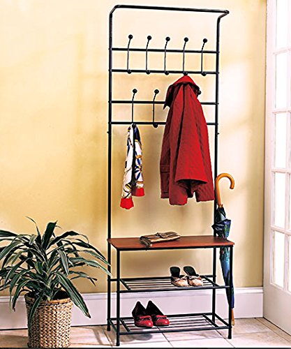 -. Feature : SAVE SPACES: Entryway Bench with Rack offers handy storage space and a place to sit to put on or take off your shoes; The metal rack features 18 hooks with protective knobs to hold jackets, backpacks, bags, umbrellas, scarves and more. / DURABLE: Metal and Wood; Dimensions: 70-1/4" x 25-3/4" x 12-1/4" overall / SOLUTION MULTIPURPOSE: A handy top rod is perfect for hanging dry cleaning when you first get home. Use the sturdy wooden bnech for getting ready or as an additional storage shelf. The 2 shelves underneath the bench are ideal for keeping shoes and boots neat and organized. / ASSEMBLY HARDWARE INCLUDED: Easy to assembly. / 30 days 100% Satisfaction Guaranteed; Full Refunds; No questions.