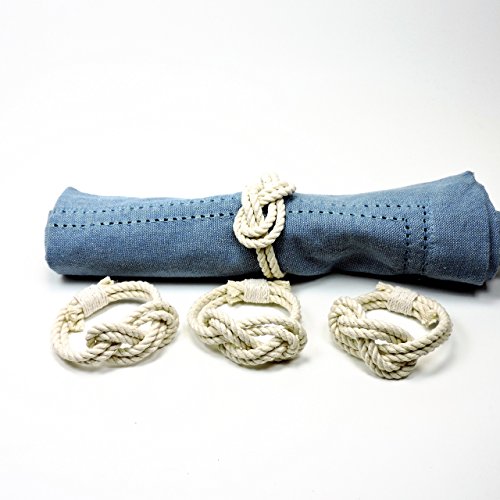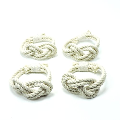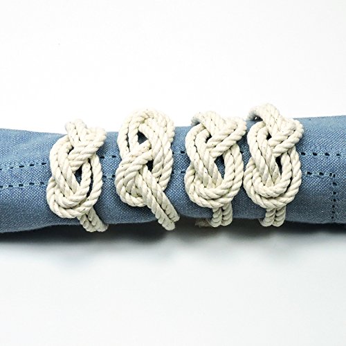 Product Description This set of 4 napkin rings is both nautical and romantic. The figure 8 knot is used in boating as a stopper knot. It is also used to represent the unity of two entities, like the unity of a couple in marriage. There are 4 napkins rings in this set. They are made out of hard laid #108 cotton cord and the ends are whipped together with a fine cotton. The inside circumference is 5 inches. 0