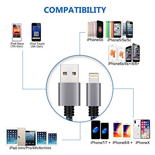 Perfect Compatibility Complete charge and sync compatibility with New iPhone X, 8, 8 Plus iPhone 7/ 7 Plus 6/ 6 Plus 6s/ 6s Plus SE 5 5s 5c iPad Pro, iPad Air/ Air 2, iPad mini/ mini 2/ mini 3/ mini 4, iPad 4 iPod Touch (5 Gen), iPod Nano 7 Compatible with the latest iOS11 operating system without any error messages.