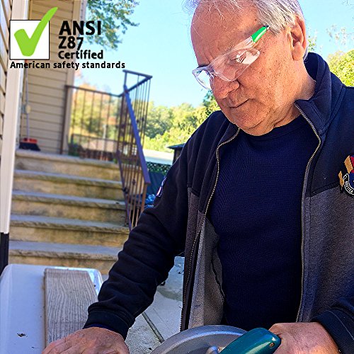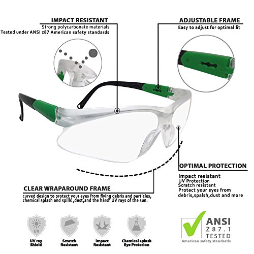 ANSI z87.1 CERTIFIED FOR HAZARD PROTECTION- Constructed with a very strong and extremely durable polycarbonate material. These glasses will protect your eyes from sudden impact, flying debris, chemical splashes, dirt, dust, and the harsh UV rays of the sun