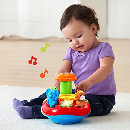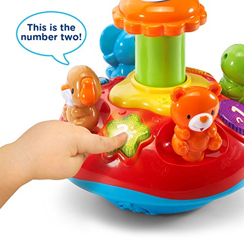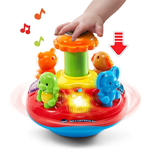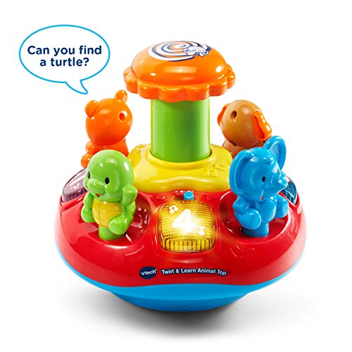 Press the four animals on the Twirl and Learn Animal Top to hear them introduce animal names, sounds, colors and play sing-along songs. Four light-up shape buttons build fine motor skills while introducing numbers and shapes and playing cheerful songs and melodies. Push down on the chunky plunger to spin the top and watch the lights flash to enhance visual awareness. Then, play a quiz game and answer the questions by pressing the buttons. Press, spin and learn! Requires 2 AA batteries (batteries included for demo purposes only; new batteries recommended for regular use). Intended for ages 9 months to 3 years.Feature