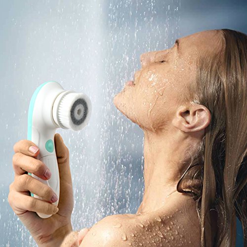 6 Rotating Brush Heads: ? Facial Cleansing Brush: For daily deep cleansing and help reduce acne breakouts. ? Silicone Face Brush: More gentle for people with sensitive skin. ? Large Body Brush: Scrub your back and other hard-to-reach places on your body ? Exfoliating Foam Head: For microdermabrasion use, twice weekly. Helps polishes your face for a silkier, smoother-feeling skin ? Rolling Massager: Improves blood circulation and skin elasticity, which stimulates collagen production and reduce fine lines and wrinkles ? Pumice Stone: Removes rough patches of skin from hands or feet