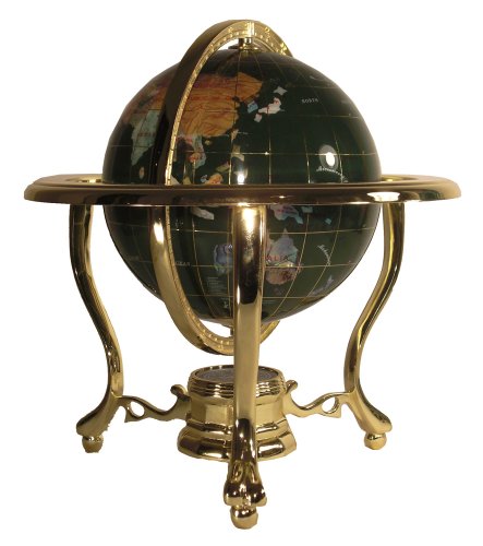 Studio : American Dwelling Group, Inc Publisher : American Dwelling Group, Inc Binding : Kitchen Product Description This unique gemstone globe is brand new and in perfect condition. It is painstakingly handcrafted by the most talented artists by, using more than 30 different semi-precious gemstones from all over the world! This globe have used large amount of malachite that pulverized, and mixed With an epoxy And Poured to make the ocean part of the globe (it is a very complicated and expensive procedure, precise control of temperature is the most essential factor in the processing cycle). This is a huge amount of striking and dramatic hand-crafted stone work. This globe is built with the beautiful ornate, 3-leg heavy gold stand into which the globe has been carefully mounted. At the bottom of the stand, a precise glass-topped integral brass compass is incorporated to complement the globe. Each country is inlaid from a different stone, and the stones are individually cut and ground to exacting interlocking shapes, polished and set into this exquisite piece of art with care and attention to adjacencies. The elements of the globe are created out of lapis lazuli, mother of pearl, amethyst, African jade, tiger's eye, jasper, turquoise, purple quartz, onyx, unakite, abalone, green marble and many other beautifully hued and richly veined stones. The latitude and longitude lines are very thin ribbons of polished brass, embedded through the globe. Each globe requires ten individual steps to compose and it takes more than 500 hours of labor to complete!10" Tall, globe itself is 6" in Diameter 0