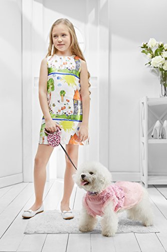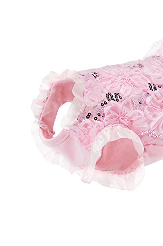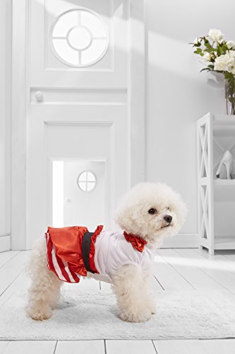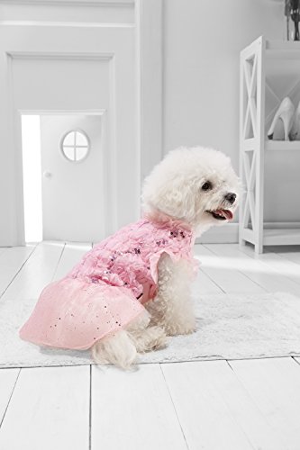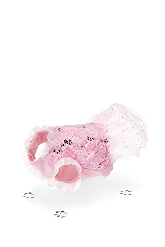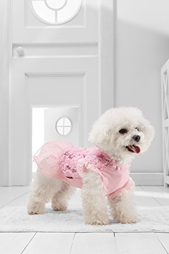 Your little pooch will become a star at any party in this stunning tutu dress. The gown for small dogs features a soft cotton bodice with mesh overlay, fabric flowers and sequins over the back. The short tutu skirt boasts a layer of glitter mesh over two layers of tulle. The pullover dress has no fasteners, it is easy to put on and off due to the elastic band at the belly.