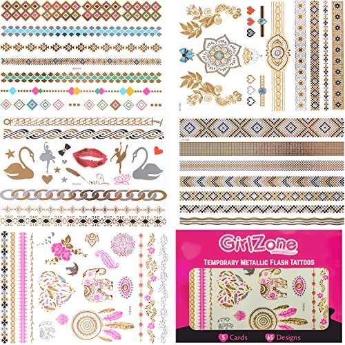On the beach, in the pool, at parties or just while hanging out with friends, stand out from the crowd this summer with GirlZone's gorgeous jewellery-inspired temporary metallic flash tattoos. As a young fashionista, you'll love our amazing choice of 65 designs in gorgeous colours and shimmering metallics, which can be applied in a myriad of combinations to suit your mood.