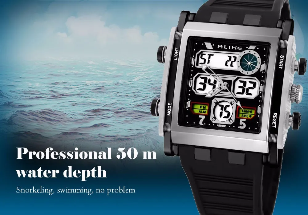 Feature:Auto Date,Rattrapante,Alarm,Water Resistant,LED display,Stop Watch,Diver,Multiple Time Zone,Complete Calendar,Swim,Back Light