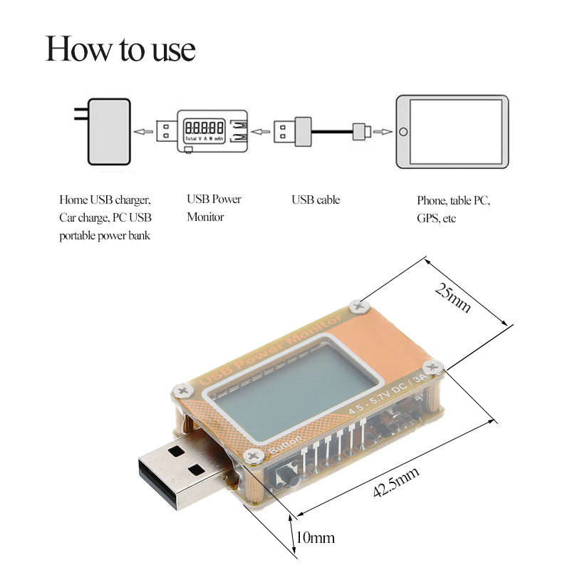 The USB power monitor can be used to measure the output performance of any USB charging adapters£? PC USB£? car USB chargers !#!amp!*! power banks etc. It can also be used to diagnose faulty USB ports£? evaluate the quality of USB cables !#!amp!*! the capacity of portable power source.