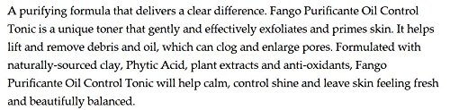 A purifying formula that delivers a clear difference. Fango Purificante Oil Control Tonic is a unique toner that gently and effectively exfoliates and primes skin. It helps lift and remove debris and oil, which can clog and enlarge pores. Formulated with naturally-sourced clay, Phytic Acid, plant extracts and anti-oxidants, Fango Purificante Oil Control Tonic will help calm, control shine and leave skin feeling fresh and beautifully balanced.Feature