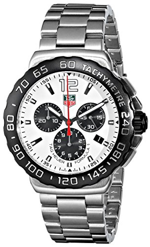 -. Binding : Watch -. Brand : TAG Heuer -. Color : White -. Department : mens -. EAN : 7612533097247 -. Feature : Round watch with black tachymeter bezel and white dial with contrasting black subdials and date window / 42 mm stainless steel case with anti-reflective sapphire dial window / Swiss quartz movement with analog display / Stainless steel band and fold-over clasp with safety closure / Water resistant to 200 m (660 ft): In general, suitable for professional marine activity and serious surface water sports, but not scuba diving -. IsAdultProduct : 0 -. Label : TAG Heuer -. Manufacturer : TAG Heuer -. Model : CAU1111.BA0858 -. MPN : CAU1111.BA0858 -. NumberOfItems : 1 -. PackageQuantity : 1 -. PartNumber : CAU1111.BA0858 -. ProductGroup : Watch -. ProductTypeName : WATCH -. Publisher : TAG Heuer -. ReleaseDate : 2014-09-30 -. SKU : p8905 -. Studio : TAG Heuer -. Title : TAG Heuer Men's CAU1111.BA0858 Formula 1 Stainless Steel Watch