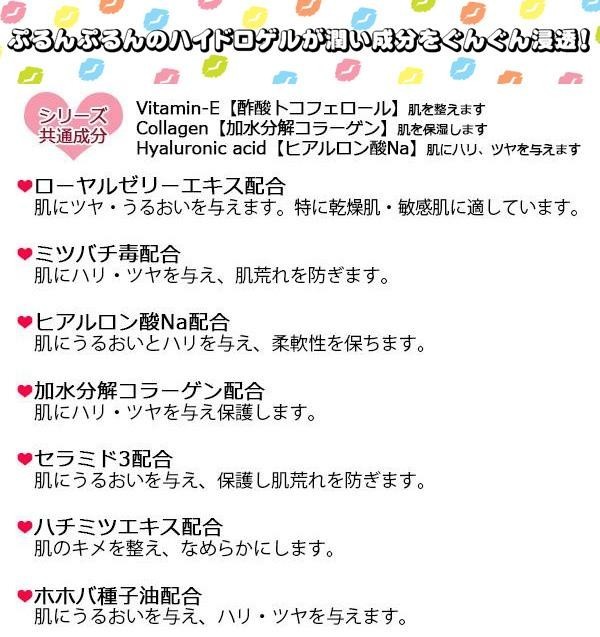 | 成分 | 水、グリセリン、BG、ローカストビーンガム、キサンタンガム、エチルヘキサン酸セチル、乳酸Ca、アラントイン、メチルパラベン、カラギーナン、ホホバ種子油、加水分解コラーゲン、β-グルカン、ヒアルロン酸Na、カバエキス、PEG-60水添ヒマシ油、フェノキシエタノール、ポリグルタミン酸、アロエベラ液汁、酸化鉄、ナイアシンアミド/パントテン酸Ca/アスコルビルリン酸Na/酢酸トコフェロール/ピリドキシンHCl/マルトデキストリン/シリカ/オクテニルコハク酸デンプンNa、香料、EDTA-2Na、ローヤルゼリーエキス、乳タンパクエキス、ミツバチ毒、ハチミツエキス、セラミド3 |