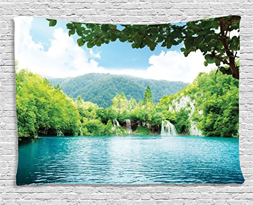 Ambesonne Cottage Decor Collection, Lake In Deep Forest Fed By Several Waterfalls In Summer, Bedroom Living Room Dorm Wall Hanging Tapestry, 80W X 60L Inch