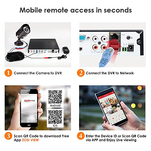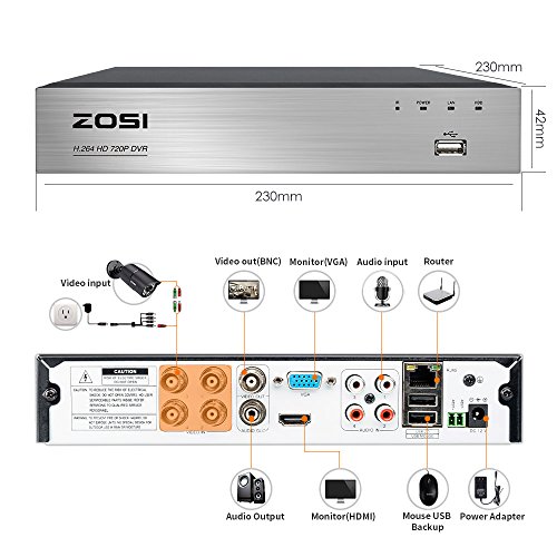 -. Binding : Camera -. Brand : ZOSI -. Color : 4Cameras+4CH 720P DVR NO HDD -. Feature : H.264 4Channel 720P DVR with 4 High Definition 1280TVL weatherproof Cameras.NO Include Hard Disk / DVR Equiped with HDMI/VGA/BNC port for multi video output, 720P Recording Resolution. HDMI Port for 1080P High Resolution Viewing. / Support USB port Back up , gives you the easiest option of backing up and transferring your video footage to a USB flash drive / Email Notification & Mobile Push Alerts when Motion Detection,Free ZOSI VIEW Apps for Live View and Playback on Smartphone / Two year quality Warranty, Life time Tech Support ! If your product stops working in the first year we will replace it. -. Label : ZOSI -. Manufacturer : ZOSI -. Model : 4GN-211B4-00 -. MPN : 4*ZG2116E+ZR04BA/00 -. PackageQuantity : 1 -. PartNumber : 4*ZG2116E+ZR04BA/00 -. ProductGroup : Photography -. ProductTypeName : SURVEILANCE_SYSTEMS -. Publisher : ZOSI -. Studio : ZOSI -. Title : ZOSI 4CH 720P AHD Security Camera System with 4 Weatherproof 3.6mm Lens 65ft Night Vision 720P Security Cameras NO Hard Drive Support Smartphone Scan QR Code Quick Remote Access