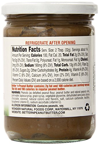 Studio : Wonder Natural Foods Corp. Publisher : Wonder Natural Foods Corp. Binding : Misc. Product Description Better 'n peanut butter contains 2g fat and 100 calories per serving versus 16g fat and 190 calories in regular peanut butter.85% less fat - 40% fewer calories all natural - gmo free no saturated fat - no trans fat gluten free - dairy free no cholesterol - no preservatives. 0