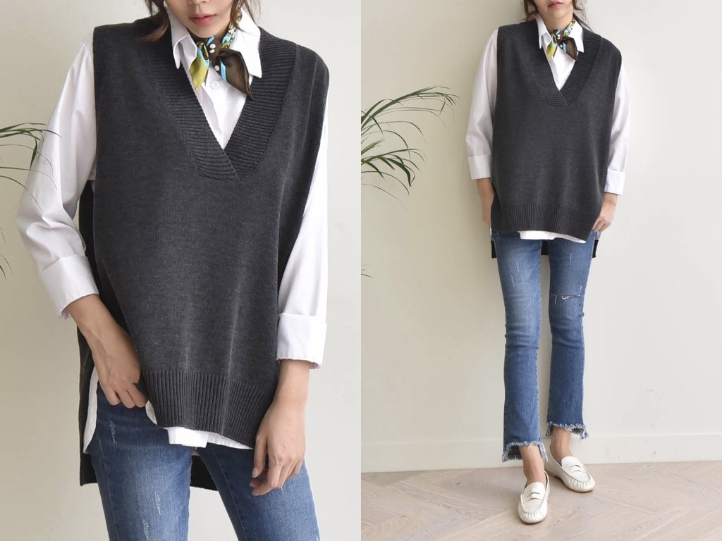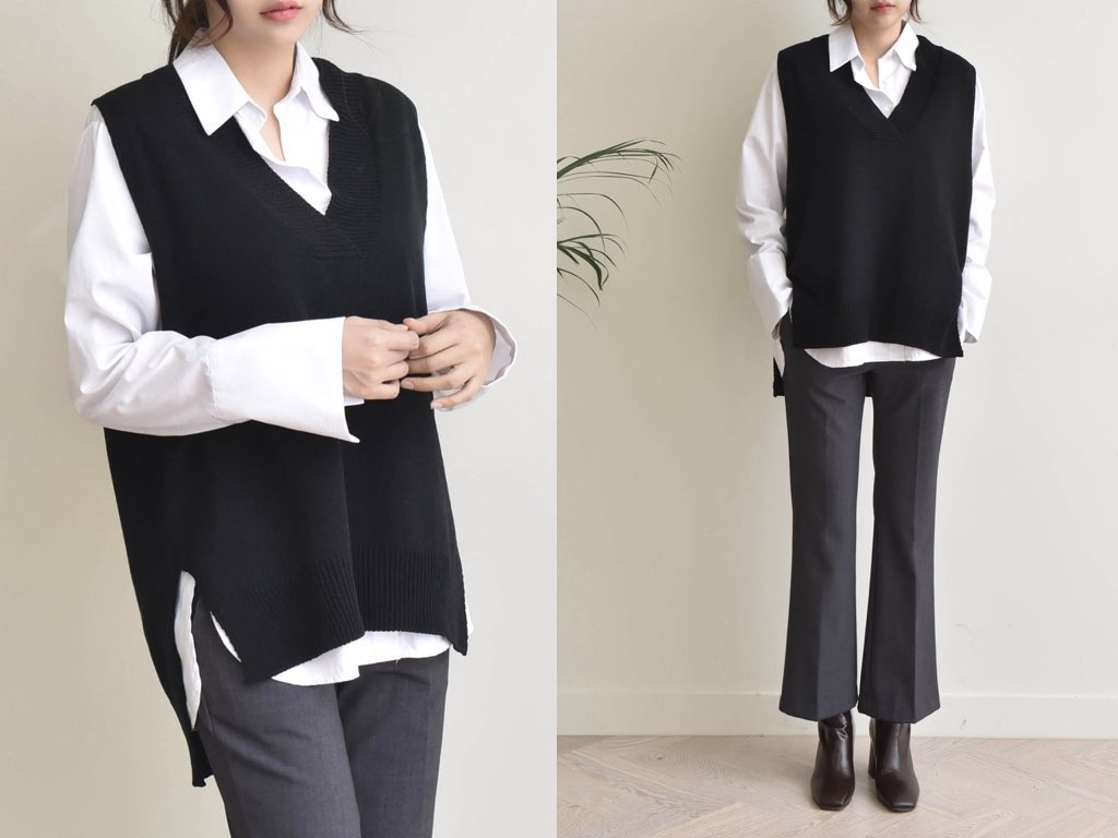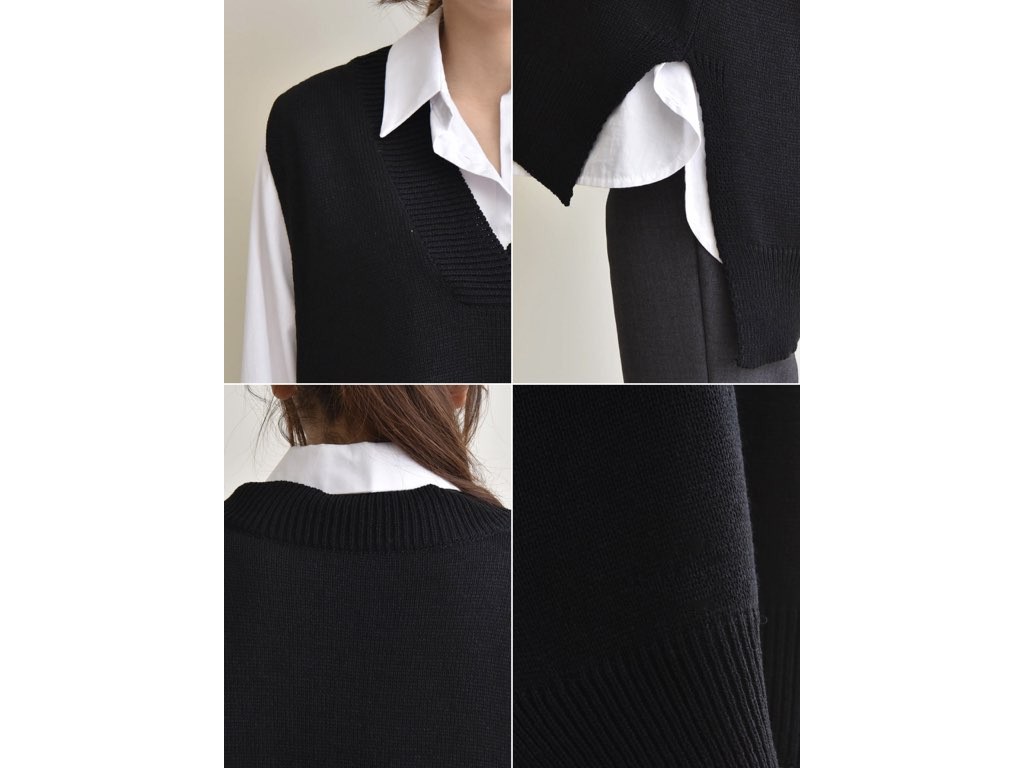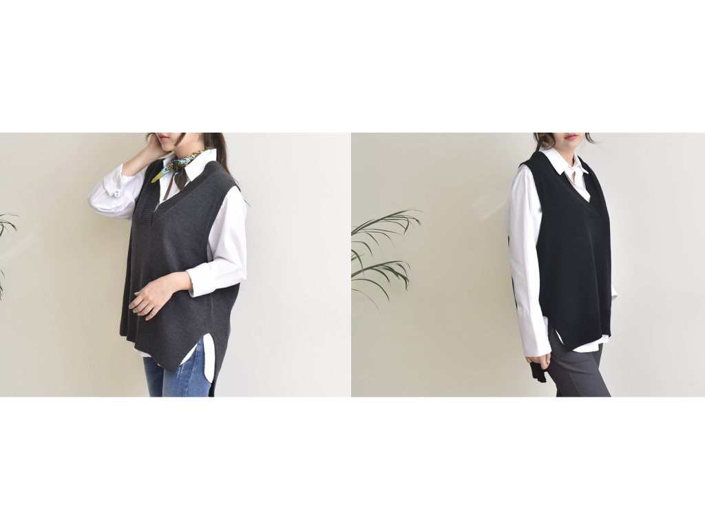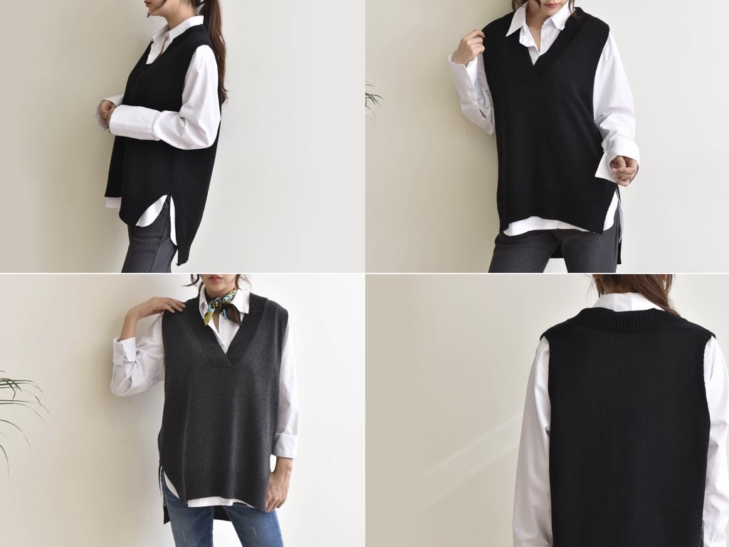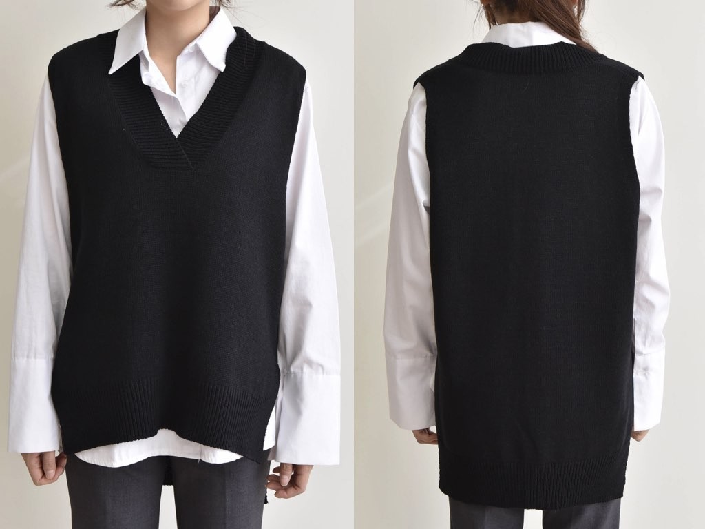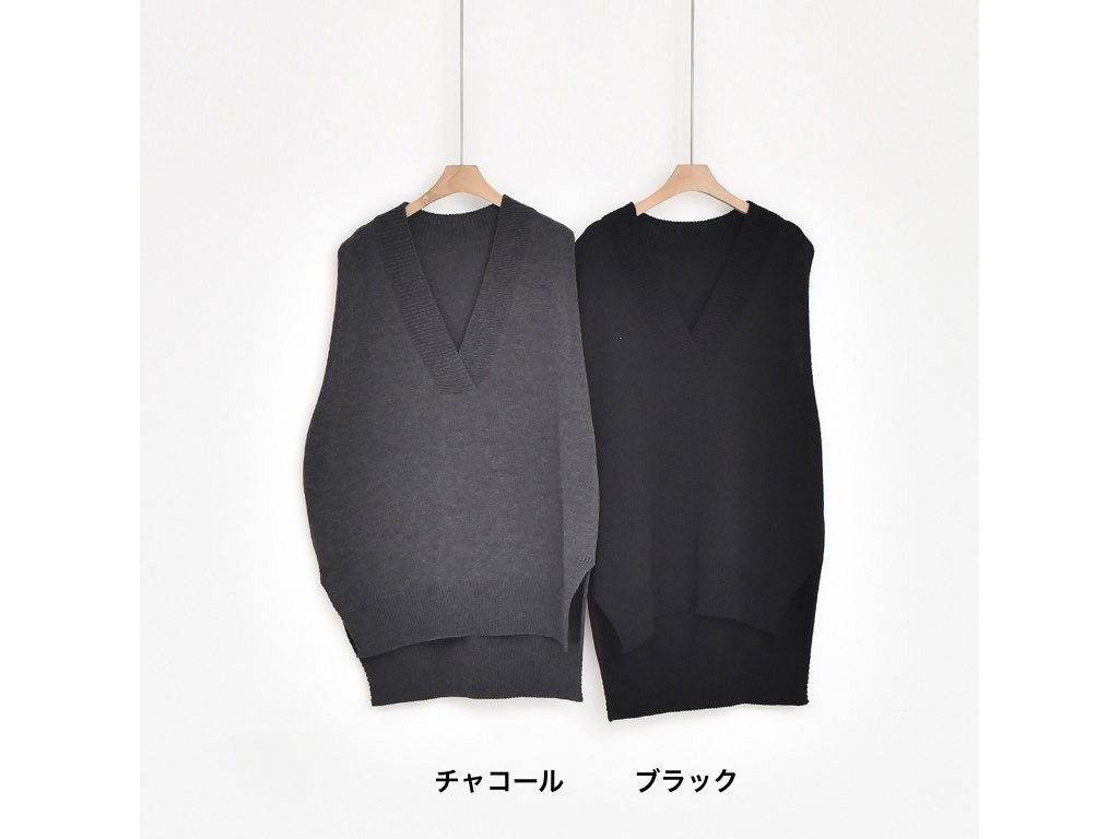 2色展開のニットのベストです。サイドにスリットが入っており、着丈(前)より着丈(後)が長いデザインとなっており、とてもスタイリッシュなデザインです。ニットなので伸縮性があって動きも楽チン快適な着心地です。1.基本情報色:2色展開(チャコール/ブラック)サイズ:Free素材:アクリル95%、ポリエステル5%製造国:korea2.サイズ情報肩幅:47cm身幅(胸断面):58cmアームホール:32cm着丈(前):66cm着丈(後):81cm(サイズは計る方法に応じて±2〜3cmの誤差があります。ご了承お願い致します)モデル着用サイズ:F※着用モデル(163cm、体重47kg、足のサイズ24.5cm)3.その他の情報厚み:中間透け感:なし伸縮性:中間裏地:なし洗濯方法:ドライ(クリーニング)[注意事項]お取り寄せ商品は、海外より仕入れるため納品まで約10日前後いただきます。また店舗でも販売しており、在庫切れになる場合もございます。ご了承お願い致します。