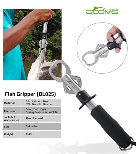 Studio : Booms Fishing Publisher : Booms Fishing Binding : Misc. Product Description Booms Fishing G1 Fish Gripper: ?? Handy tool for landing and releasing. ?? Want to take a photo with your hands clean? Just take it! ?? Provides quick action to take fish down. ?? Protect fish and your hands from hurts. Details: ??- Material: Stainless Steel Body and EVA Foam Handle ??- Models: BL024 BL025 BL026 BL027 Capacity: ??BL024: Weight: 145g Length: 9.1*2.1*1.3in Max. Drag: 55lb Open Mouth Distance: 0.6in ??BL025: Weight: 235g Length: 9.5*2.3*1.4in Max. Drag: 60lb Open Mouth Distance: 0.7in ??BL026: Weight: 125g Length: 7.6*1.2*2.1in Max. Drag: 50lb Open Mouth Distance: 0.6in ??BL027: Weight: 125g Length: 6.2*2.4*1.2in Max. Drag: 50lb Open Mouth Distance: 0.7in ??* Designed for Freshwater Fish What's in the box: ??1* G1 Fish Grip ??1* Leash