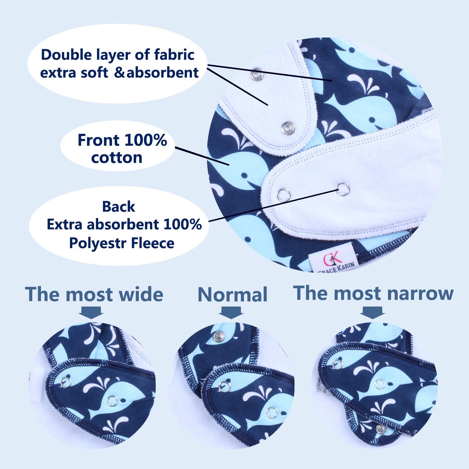 * Intelligent dual layer moisture management - It consists of 100% cotton and inner layer polyester superior in absorbability and it prevents droplets crossing the boundary from flowing into it and flowing into baby's clothing.