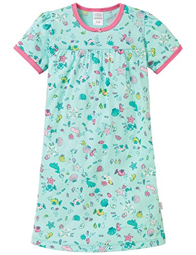 -. Feature : kurzärmeliges, türkisfarbenes Nachthemd für Mädchen aus der SCHIESSER-Serie Meermädchen mit buntem Unterwasser-Alloverprint: Muscheln, Seesterne, Fische, Wale und Seepferdchen rosafarbener Einfass mit zarter Crochetta-Ziernaht an Hals- und Armabschlüssen rosafarbenes Zierschleifchen am Halsrand feine Teilungsnaht mit Kräuselung oberhalb der Brust in herrlich bequemer Single-Jersey-Qualität / Dieses kurzärmelige Nachthemd macht Mädchenträume wahr! Fröhliche Fische, feine Muscheln und freche Seepferdchen tummeln sich kunterbunt auf frischem Türkis und bekommen mit zarten, rosafarbenen Ziernähten, dem Zierschleifchen und der Teilungsnaht mit Kräuselung hübsche Gesellschaft. In 100% weicher Baumwolle können es sich kleine Meermädchen wunderbar gemütlich machen und tolle Traumabenteuer in bester SCHIESSER-Qualität genießen!