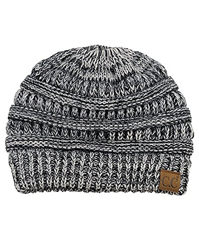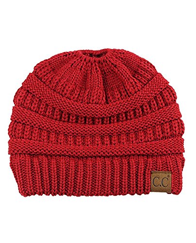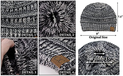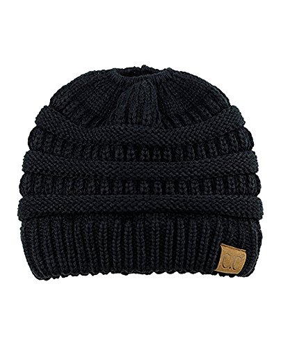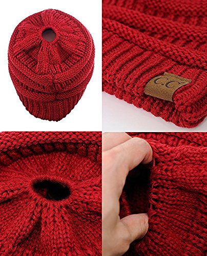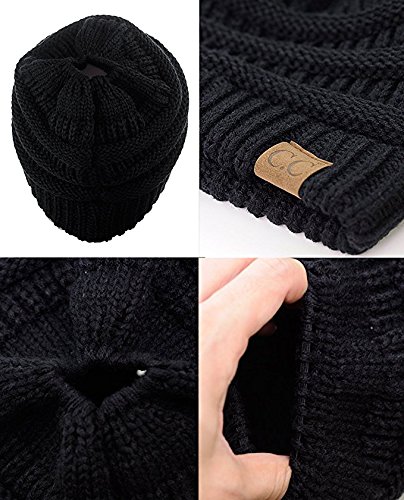 Binding : Apparel Product Description SPECIFICATION: Material: 100% Acrylic Color: Black, Gray, Rose red, White Packing Include:1* Beanie Hat Size: Head measurement: 57 cm, 22-3/8", Size 7-1/8 Detai Detail 1: Patterned soft cable knit Detail 2: Top hole to for the ponytail to go through Detail 3: Stretchable rubberband to tighten the ponytail after you wear or loosen it when you take it off Detail 4: Authentic C.C logo print on suede Color Disclaimer: Due to limitations of monitors and hardware, the colors on screen may not be a totally accurate reproduction of the actual product.