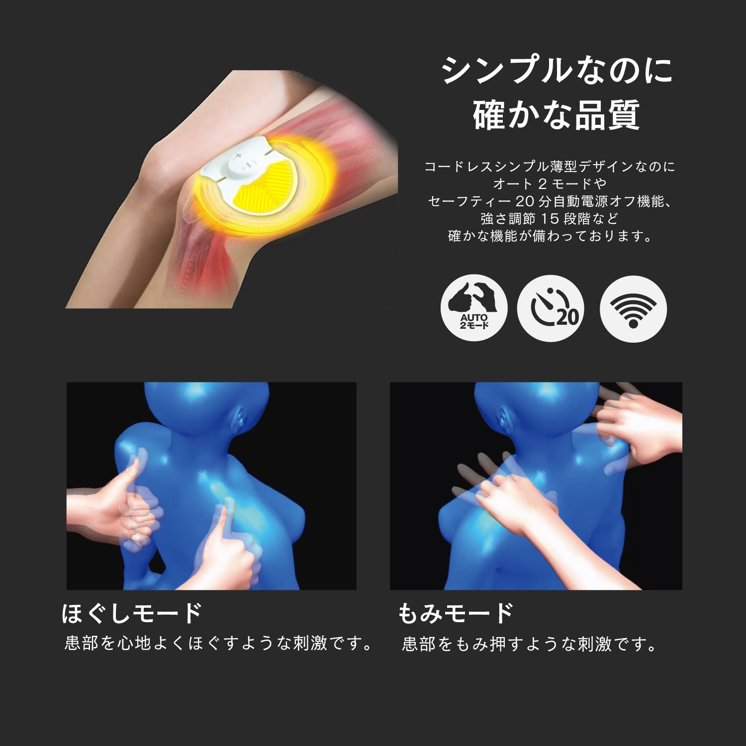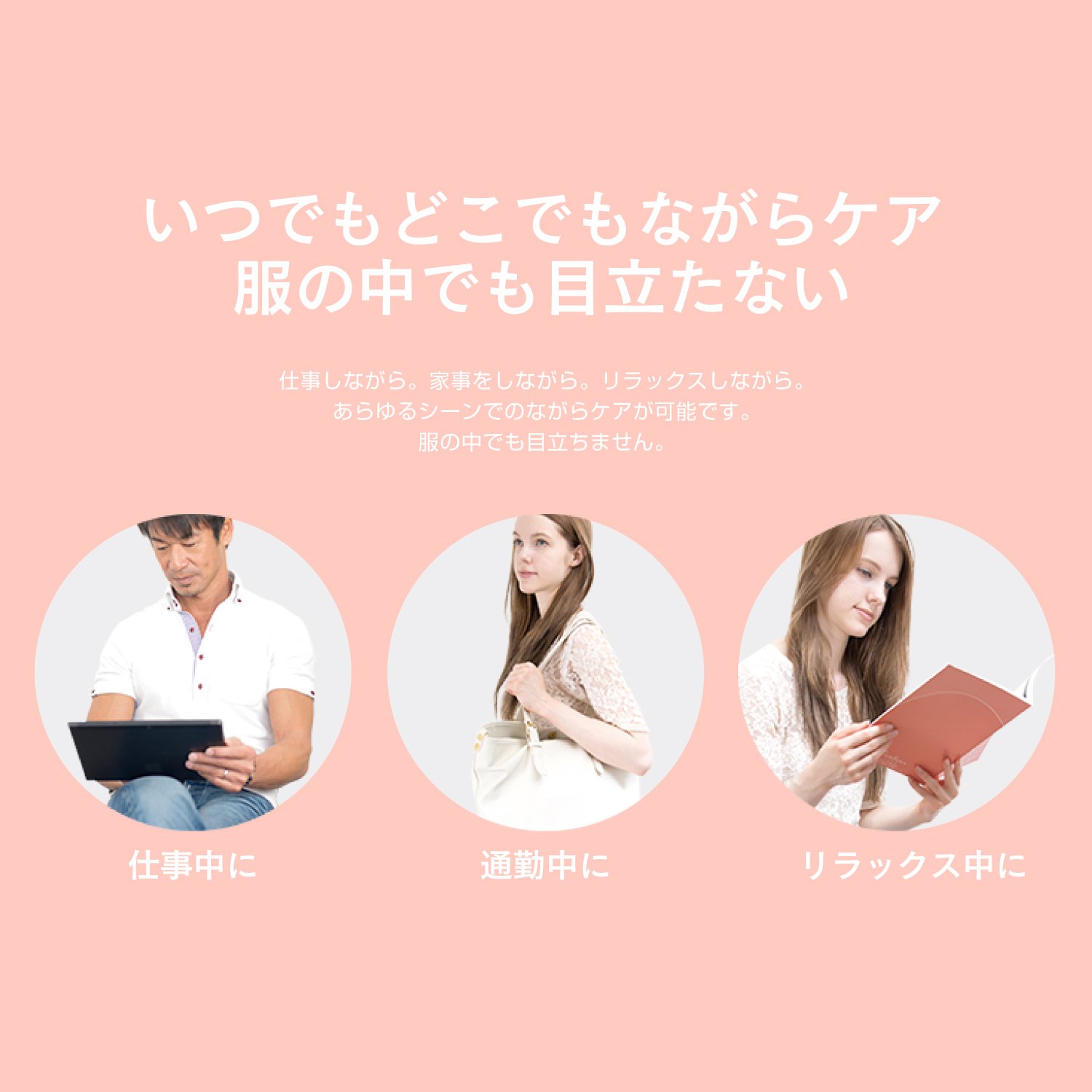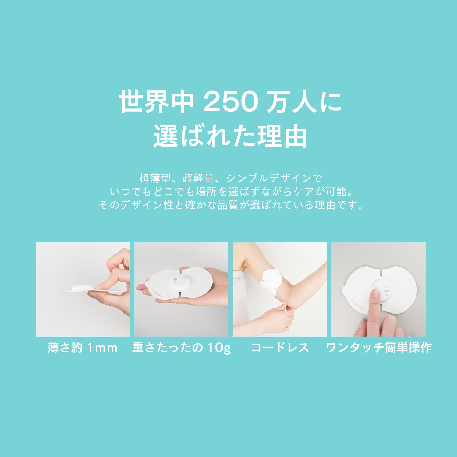 Cordless with a 1 mm thin sheet! Because it is compact, it is not noticeable even in clothes, and there are no troublesome codes, so you can care for the affected part anytime and anywhere.