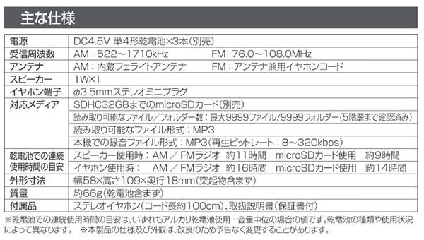 ラジオ放送をマイクロSDカードに録音できます。さらに、本機の録音マイクで周囲の音声も録音可能!ラジオ局自動メモリー登録機能(ATS:オートスキャン機能)搭載。AM・FMそれぞれ最大40局まで登録でき、よく聴く放送局をダイレクト選局ボタン(1~3)に登録することもできます。マイクロSDカードから、スキップ・サーチ・リピート再生ができます。 |