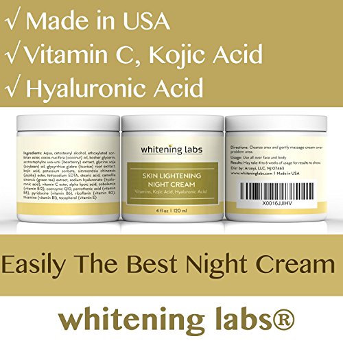 -. Feature : # 1 WHITENING CREAM - Most Impressive brightening ingredient in the beauty landscape, Kojic Acid's skin lightening properties can help address signs of sun exposure, uneven skin tone and dark spots with regular long term use. / SKIN LIGHTENING - Night Cream with not only brightening properties, but age defying anti-aging ingredients like Vitamin C, Hyaluronic Acid and more. / PROUD AMERICAN - Product formulated and manufactured in USA. / WHITE TEA AROMA - Helps boost your night time routine by gently soothing your senses and helping with better sleep. / # 1 CUSTOMER SERVICE - Whitening Labs® is committed to world class customer services and promises to deliver. In case of any issues, write to us and we promise to make it right.