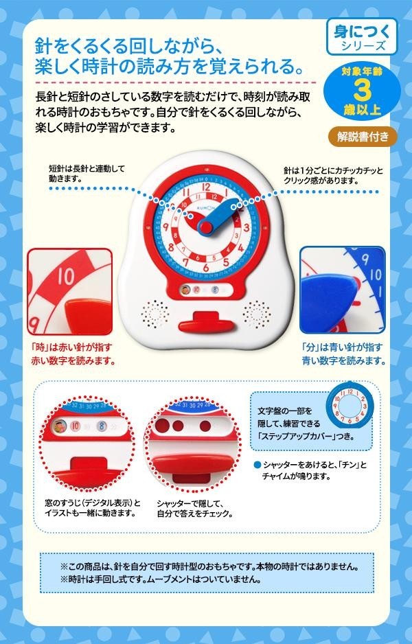 | 針を自分で回して時計の読み方を練習する「時計のおもちゃ」です。針と同じ色の数字を読むだけで、正しい時刻がわかります。アナログ表示だけでなく、針と連動する「デジタル表示」もありますので、正しい時刻が簡単に確認できます。 |