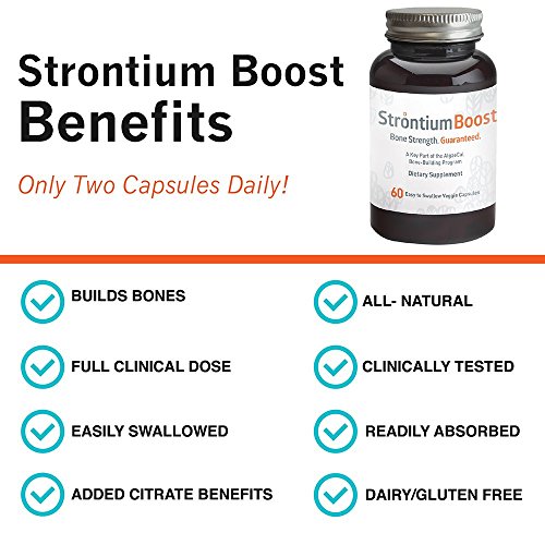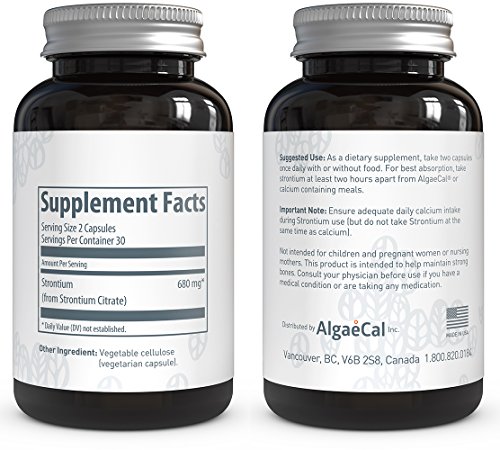 -. Binding : Health and Beauty -. Brand : AlgaeCal -. EAN : 0893618000506 -. Feature : Strontium Boost by AlgaeCal is the ONLY Strontium Citrate supplement in the market that has human clinical studies that are published and peer-reviewed by two prominent journals (Pubmed and Nutritional Journal) to prove its safety and efficacy in bone health. / If you are actively trying to increase bone mineral density then it is recommended to take both AlgaeCal Plus and Strontium Boost / Strontium Boost is a perfect compliment to AlgaeCal Plus. When used together the combination is clinically supported to build stronger, healthier bones. / ALL NATURAL INGREDIENTS. Studies have shown Strontium to be very effective in enhancing bone growth / Made and Shipped from the USA. Order yours TODAY! -. Label : AlgaeCal Inc -. Manufacturer : AlgaeCal Inc -. NumberOfItems : 1 -. PackageQuantity : 90 -. ProductGroup : Health and Beauty -. ProductTypeName : HEALTH_PERSONAL_CARE -. Publisher : AlgaeCal Inc -. Studio : AlgaeCal Inc -. Title : Strontium Boost - Natural Strontium Citrate Supplement by AlgaeCal, 60 Veggie Capsules. -. UPC : 893618000506