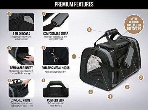 -. Feature : THE BEST PET CARRIER YOU WILL EVER OWN! Keep your furry friend safe, comfortable, and happy in the Gorilla Grip Pet Carrier. Features include: 4 soft mesh doors for better air circulation (including top load option), all zippered exits have safety clips, internal leash, front storage pocket, adjustable padded comfort strap with pass through, and rotating metal hooks to keep your strap tangle-free. PLUS, a soft, removable, washable Sherpa insert with firm bottom to keep your pet stable and snug. / FREE BOWL: We love our customers and their pets! Our pet carrier comes with a FREE bowl perfect for food or water on-the-go. Bowl fits perfectly in our zippered pocket. / SAFETY FIRST: Travel with confidence! Features our unique ZIPPER LOCK CLIPS that prevent your nosy friend from opening the carrier during travel. An internal leash keeps your pet secure inside the carrier. / AIRLINE APPROVED: generous 17.5" x 11 x 11.4" size fits comfortably under seat and meets airline and TSA requirements. Perfect for small pets up to 15 lbs. Please check with individual air carrier before travel to ensure you are compliant. / WARRANTY: We are proud to offer our customers a 10-Year Guarantee on your purchase.