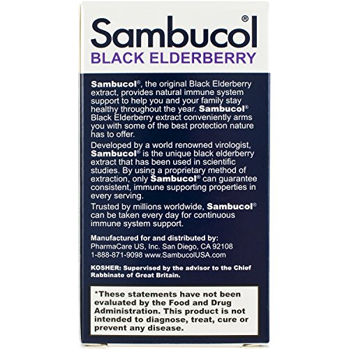 Sambucol, the original Black Elderberry extract, provides strong immune system support to help you and your family stay healthy throughout the year. By using a proprietary method of extraction, only Sambucol can guarantee consistent, immune supporting properties in every serving. Sambucol uses only specific European Elderberries (Sambucus Nigra) for our products. Black Elderberries have been recognized for centuries for their immune-supportive properties. Sambucol is a unique black elderberry extract rich in immune supporting flavonoids. Flavonoids are powerful, natural antioxidants that are thought to work to protect the body’s cells from the potential damage caused by free radicals. Certain flavonoids – anthocyanins – are found primarily in the pigments of dark blue and deep purple fruits such as the black elderberry. They assist with the body’s natural defenses and cell communication, providing immune support.* *These statements have not been evaluated by the Food and Drug Administration. This product is not intended to diagnose, treat, cure, or prevent any disease. Not suitable for children under 3 years Free from artificial colors, flavors and gluten.Feature