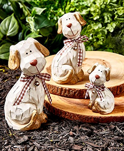 - This Set of 3 Dog Statues is an absolute delight for animal lovers. Each wears a bright smile on its face and is adorned with a checkered bow. The dogs are also accented by a small bell.