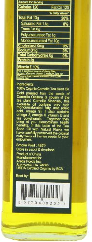 Arette Tea Seed Oil (Tea Oil) is produced from cold pressing of the seeds of the camellia trees. Organically grown in remote and pollution-free mountains, Tea Seed Oil (Tea Oil) from the camellia trees have been a hidden treasure for centuries. Only after seven years do the young camellia trees produce seeds. Once the seeds appear, it takes a full year of further natural growth for them to swell with nutrients before they can be hand picked for cold pressing. Current laboratory studies have proven Arette Tea Seed Oil (Tea Oil) is one of the most nutritious and healthiest edible oils. The high unsaturated fat content of Arette Tea Seed Oil (Tea Oil) can promote cardiovascular health, help boost the immune system and maintain a healthy cholesterol level. Arette Tea Seed Oil (Tea Oil) is also high in antioxidant activity. High in nutrition and 100% organic are among the many benefits of this unique Tea Seed Oil (Tea Oil). With subtle nutty flavor, tea-like aroma and high smoke point, Arette Tea Seed Oil (Tea Oil) is excellent for dressing, baking, stir-frying and more.Feature