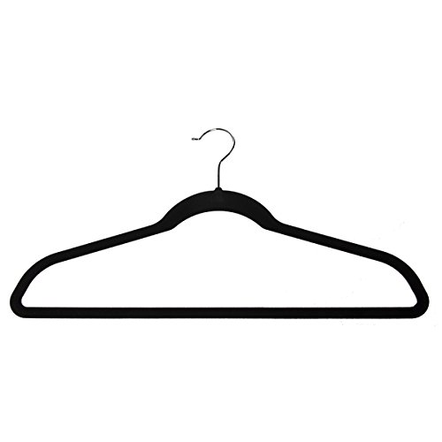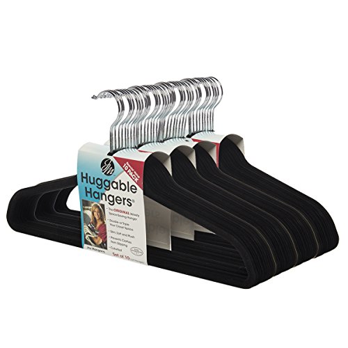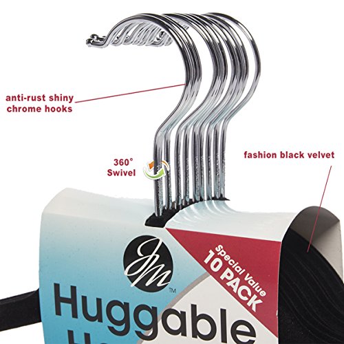 -. Feature : Thin clothes hangers with soft colorfast coating stops clothes from slipping; Non-slip hangers curved ends preserve garment shape, with no creases, dimples or puckering for wrinkle-free clothes; Slim, compact, space saving closet hanger design can triple space / Black velvet clothes hanger flocked w/ chrome plated metal hooks; all same color for coordinated closet; Multifunctional closet hangers for suits, shirts, dresses, coats & jackets, blouses, cross bar for pants & jeans, delicates, accessories & other clothing / Heavy duty hangers designed by American inventor Joy Mangano; Strong & durable storage, premium closet organization for neat wardrobe; Good Housekeeping seal of quality; made in China / 360 degree rotatable swivel hook; Hangers: 17.75"W x 9.75"H x .2"D each; Bulk set of 40 hangers / (40) Joy Mangano Huggable Hangers (4 Packs Of 10), Black Velvet & Chrome Metal, New In Retail Packaging