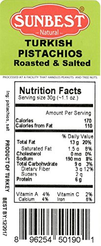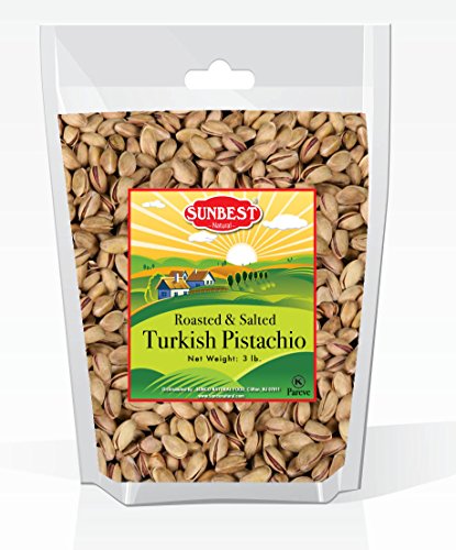 -. Feature : SUNBEST 3 lbs Turkish Pistachios Roasted and Salted in Resealable Bag / Health Benefits: Great source of carbohydrates, proteins, fats, dietary fiber, phosphorus, potassium, thiamine / Rich in vitamins such as, vitamin E, vitamin A, and vitamin K / Great for snacking, topping, or baking / OK Kosher Certified
