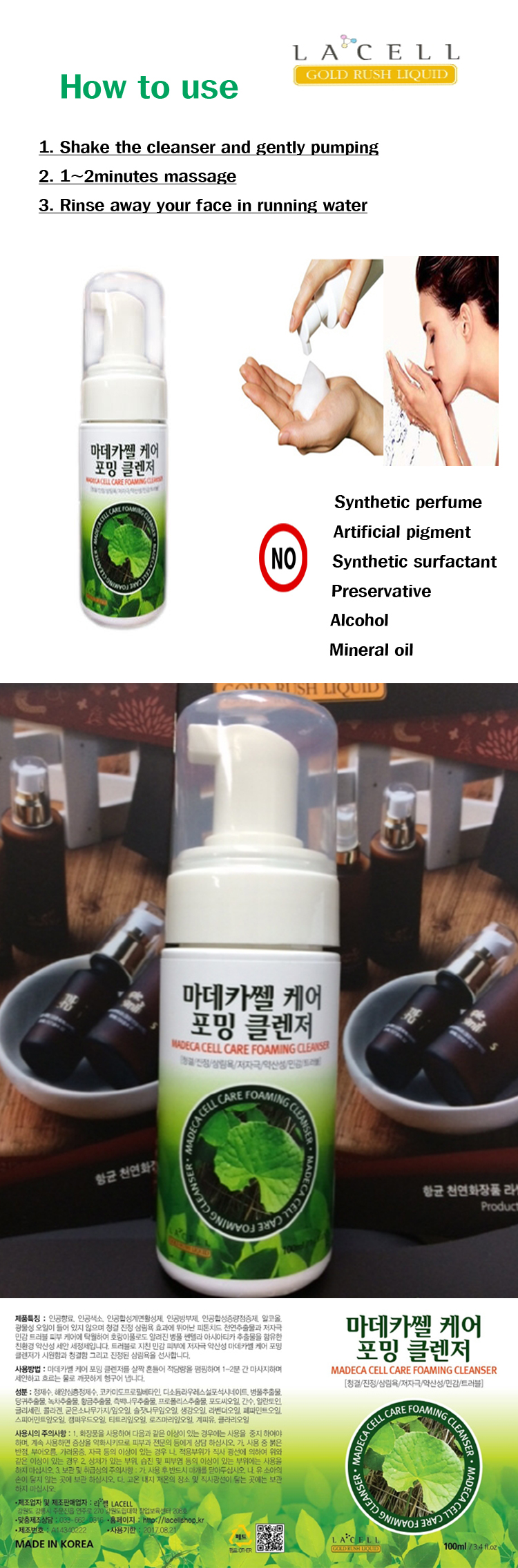 - Shake the cleanser and gently pumping and then 1~2minutes massage.