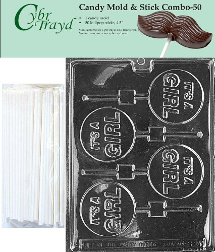 Cybrtrayd 45St50-B024 It's A Girl Lolly Chocolate Candy Mold with 50 Cybrtrayd 4.5" Lollipop Sticks