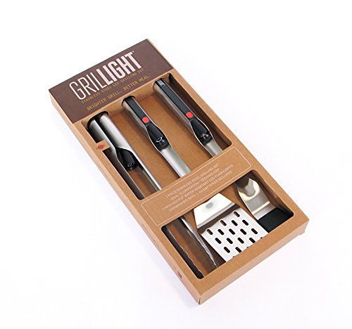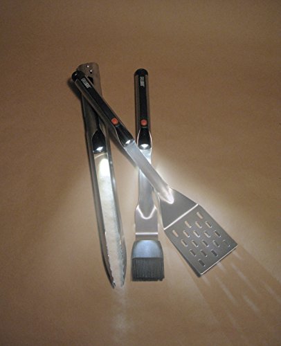 - Set of 3 stainless steel grilling tools set with LED flashlight built into the handles; spatula, tongs, high heat silicone basting brush
